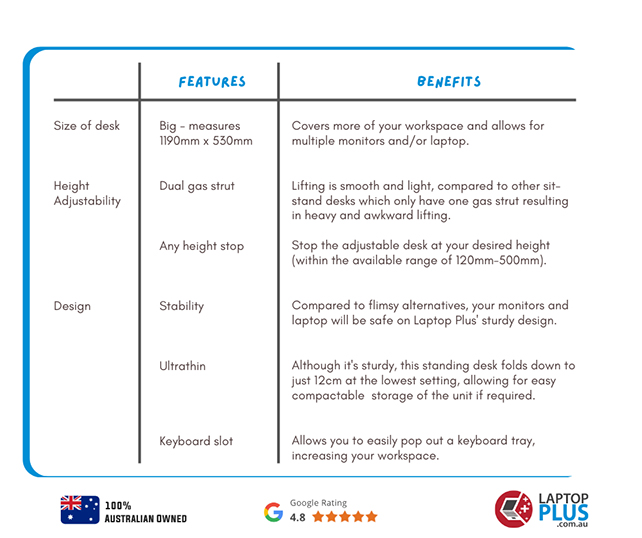 To help you decide and compare the difference between our premium Laptop Plus Standing Desk and other sit-stand desks available on the market, use the table below. At a glance, you can easily identify and discover the features and benefits of our Laptop Plus Standing Desk. Let's take a look.