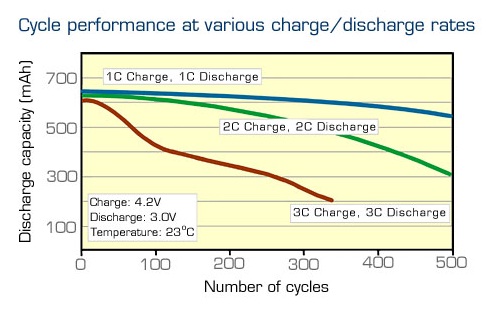 Generally speaking, batteries live longer if treated in a gentle manner. High charge voltages, excessive charge rate and extreme load conditions will have a negative effect and shorten the battery life. This also applies to high current rate lithium-ion batteries. Not only is it better to charge lithium-ion battery at a slower charge rate, high discharge rates also contribute the extra wear and tear. Figure 3 shows the cycle life as a function of charge and discharge rates. Observe the good laboratory performance if the battery is charged and discharged at 1C. (A 0.5C charge and discharge would further improve this rating.)